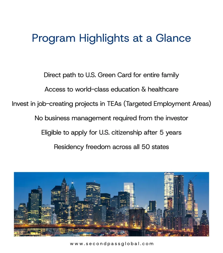 This program grants your entire family access to permanent residency in 12–24 months, with the added benefits of top-tier education, advanced healthcare, and the freedom to live anywhere in the U.S. Invest in government-approved, job-creating projects located in Targeted Employment Areas, no active business management needed. After 5 years, you’re eligible to apply for U.S. citizenship.